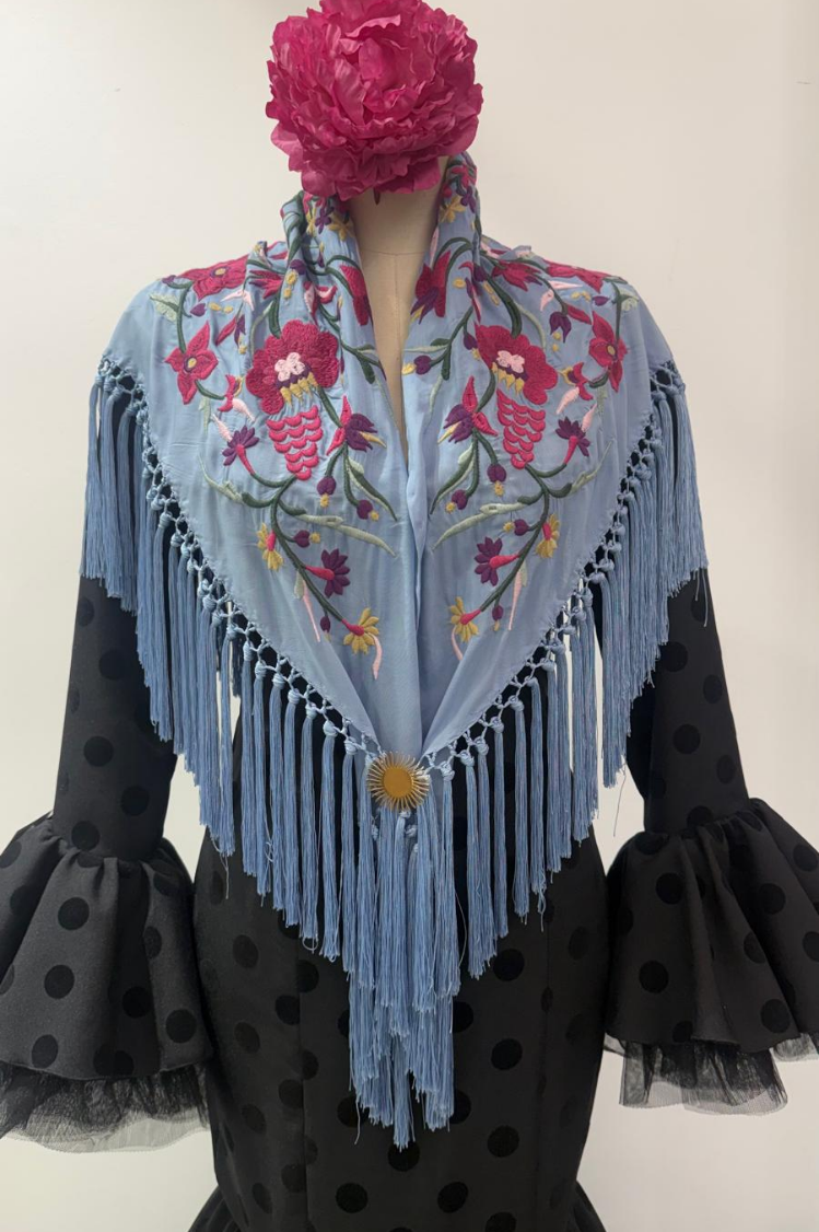 Confeccionado artesanalmente en Sevilla, este mantoncillo bordado conserva la esencia de la moda flamenca más tradicional con un toque mas actual.