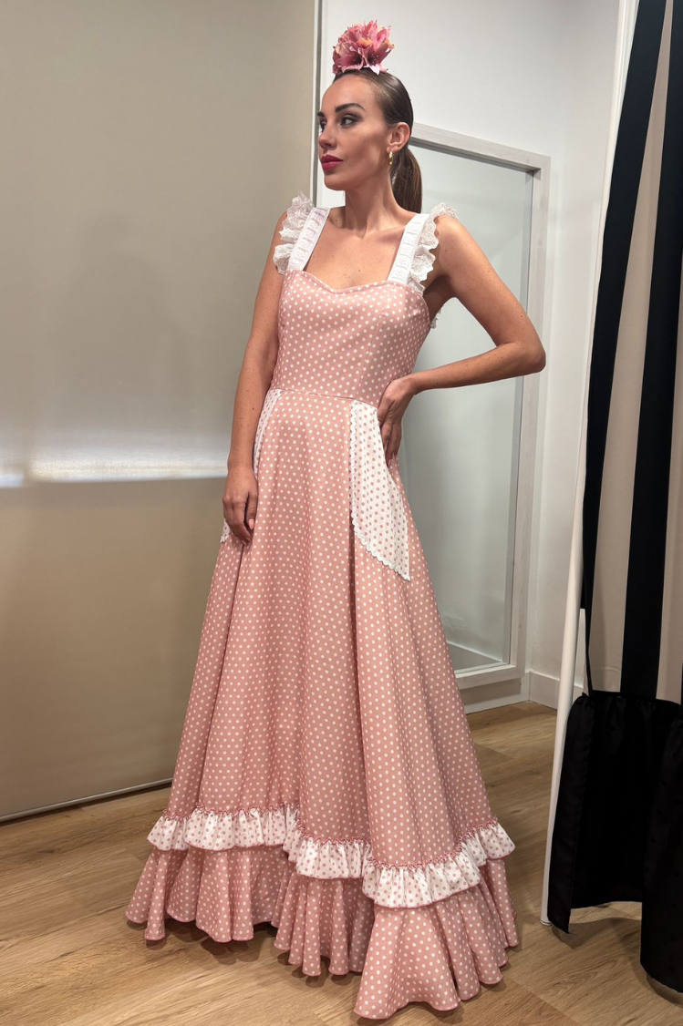 Bata rociera confeccionada en tejido de alta calidad, con corte a la cintura que realza la silueta y una falda que aporta mucho movimiento y vuelo.