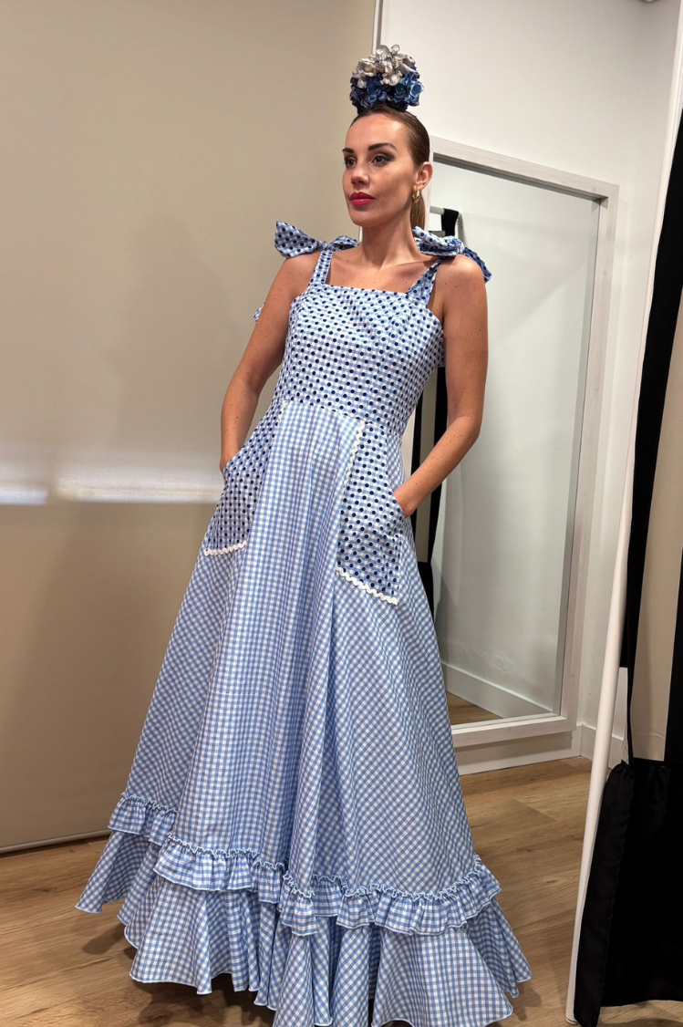 Bata rociera confeccionada en tejido de alta calidad, con corte a la cintura que realza la silueta y una falda que aporta mucho movimiento y vuelo.