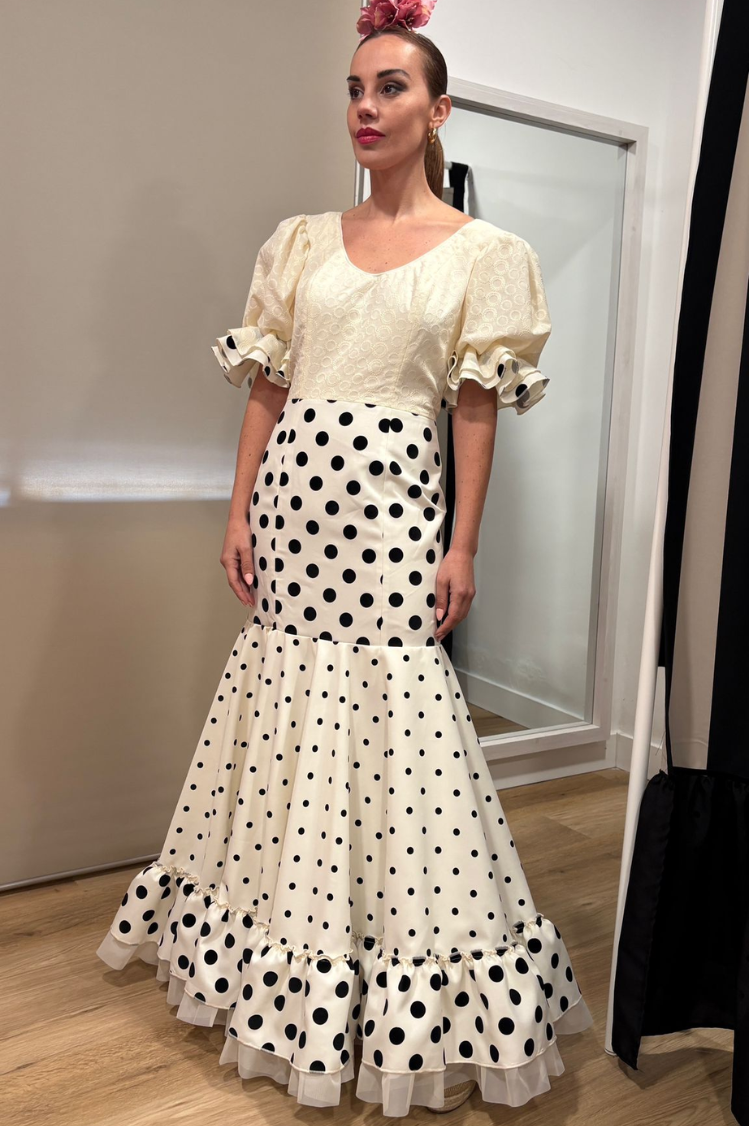 Bata rociera confeccionada en tejido de alta calidad, con corte a la cintura que realza la silueta y una falda que aporta mucho movimiento y vuelo.