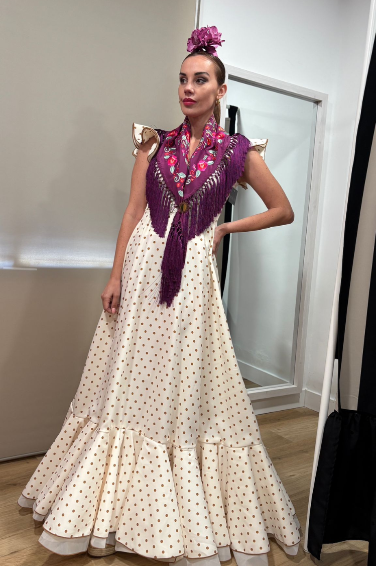 Bata rociera confeccionada en tejido de alta calidad, con corte a la cintura que realza la silueta y una falda que aporta mucho movimiento y vuelo.